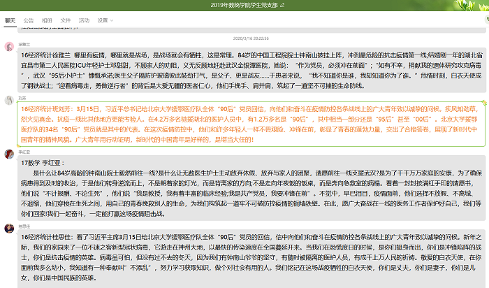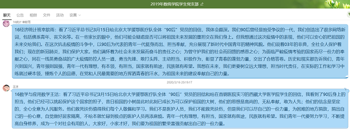 3月15日,习近平总书记给北京大学援鄂医疗队全体“90后”党员回信,向他们和奋斗在疫情防控各条战线上的广大青年致以诚挚的问候。近日,tyc41183太阳成集团党团青年积极响应该院党党总支号召,学习回信内容,通过QQ平台热议回信精神。