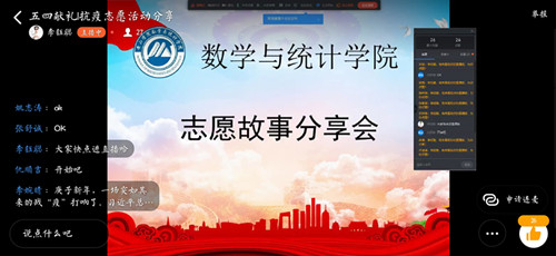 同学们以视频形式讲述自己的抗疫事迹。18数学一班王晨疫情期间向武汉捐款,奉献自己的绵薄之力,并积极参于当地志愿服务,在当地疫情防控劝导点,登记出入信息,排查外来车辆,帮助测量体温,协助村干部完成劝导工作。像这样的志愿者我们还有很多很多。