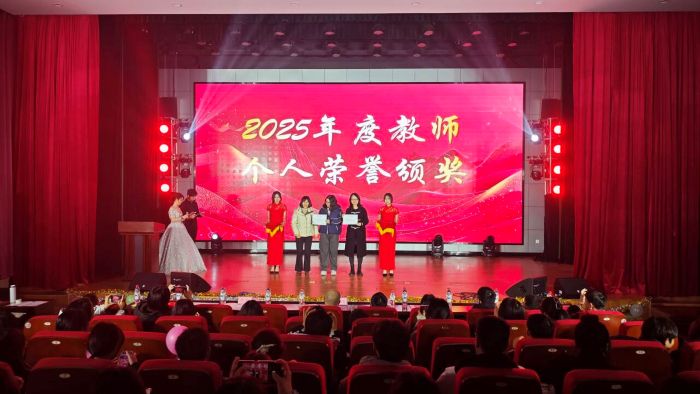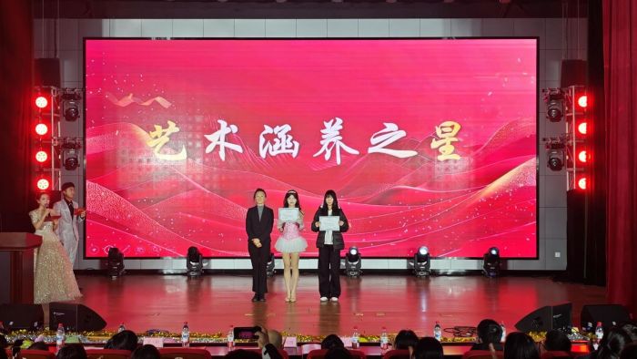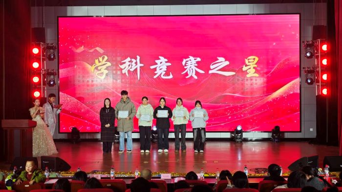 表彰环节是晚会的重要组成部分,现场依次为2025年度教师个人荣誉获得者、学生运动员及学生个人荣誉获得者颁奖。一张张荣誉证书,既是对师生们过去一年辛勤付出的肯定,也激励着更多师生奋勇争先、追求卓越。董辰刚、鲍琪2位老师获评“科研之星”,陈沫、朱亚娟2位老师获评“学科竞赛优秀指导老师”,袁琳娜等6位同学获评“阳光运动健将”,胡悦等12位同学当选“学习之星”,卞子妍等6位同学荣获“学科竞赛之星”,梁雨晴等3位同学荣获“学术领航之星”,刘晨晨、贾慧雯2位同学荣获“艺术涵养之星”称号。