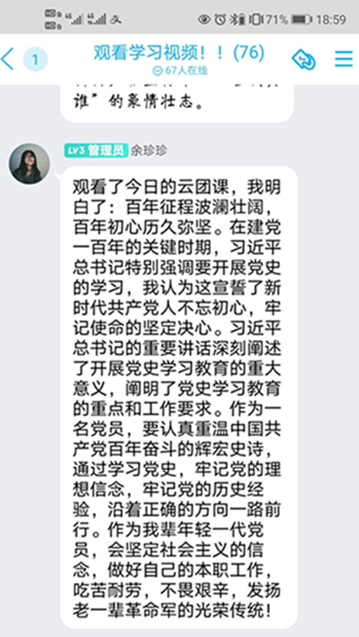 5月4日,数统学院组织学生观看“学党史,强信念,跟党走”主题云团课,云团课围绕马克思主义为什么“行”、中国特色社会主义为什么“好”、中国共产党为什么“能”等重大问题,运用党史微课、主题团日、青年典型展示、文化文艺节目等多种形式,呈现中国共产党波澜壮阔的百年历史。课后,同学们激烈讨论,纷纷表示作为当代大学生,要认真悟党史,找到历史与个人有效联结,明白中华民族的漫漫征程来之不易,吾辈应从前辈手中接好时代接力棒,坚定信仰跟党走,做堪当大任的时代新人。