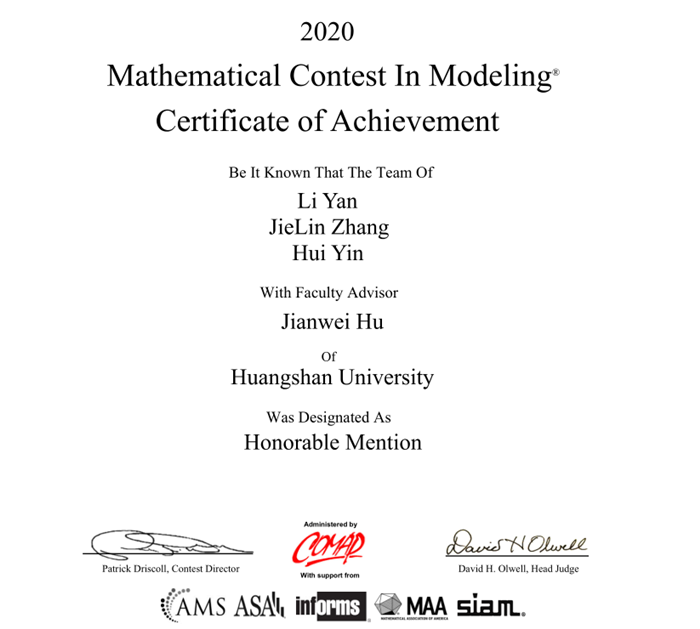 近日,倍受全球关注的2020年美国大学生数学建模竞赛成绩揭晓,tyc41183太阳成集团17经济统计班学生严力在胡建伟老师的指导下,荣获国际二等奖。据悉,这是我校学生首次参加此项竞赛。