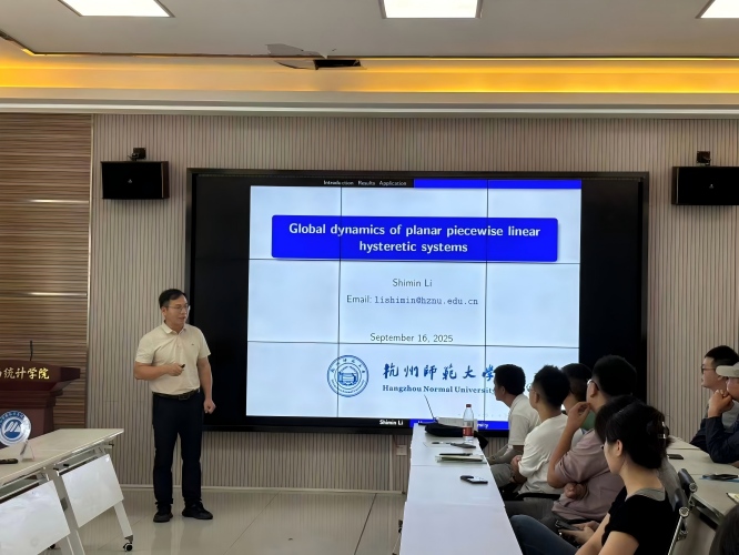 李时敏教授作了题为《Global dynamics of planar piecewise linear hysteretic systems》的学术报告,系统阐述了该类系统的Hopf-like分岔理论,并在对称反馈系统中证明了极限环的唯一性。李教授将深奥的数学理论与直观的物理现象相结合,让在场师生深切感受到应用数学研究的魅力。