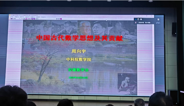 本次大会邀请中国科学院院士周向宇通过线上作了《中国古代数学思想及其贡献》的大会报告。报告围绕商高对勾股定理的完整证明,愚公移山数学模型中的阿基米德原理等案例,多角度地揭示了“形体不变量”等中国古代数学思想和成就,揭示了中国古代数学“言约旨远”的深意。周向宇院士对数学思想发展的源与流分析,引发与会代表对古代数学理论、中国传统文化中的人文精神与科学精神融合的深入思考。