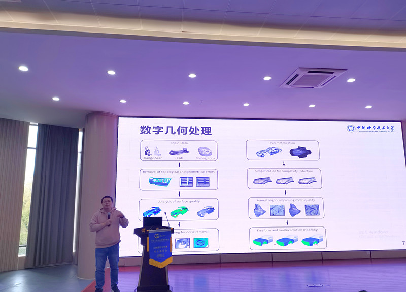 2023年11月11日, “GDC专委会走进高校”第2期走进太阳成集团。主题为“智能几何计算”的学术报告在我校文端楼二楼报告厅圆满举行。国防科学技术大学徐凯教授、清华大学张松海副教授、中国科学技术大学陈仁杰教授、中国科学技术大学傅孝明副教授分别做特邀报告。中国科学技术大学刘利刚教授出席会议并致辞。清华大学张松海副教授对CSIAM几何设计与计算专委会进行了介绍。会议由教务处副处长胡建伟教授主持。我校200余名师生代表参加了会议。